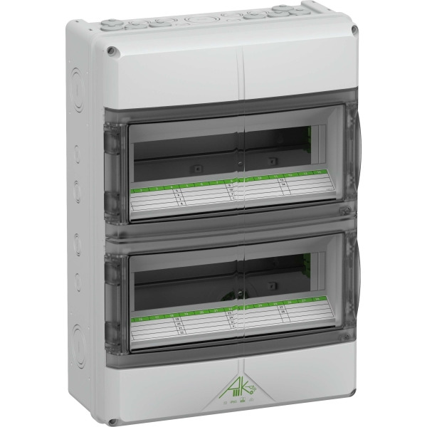 Kleinverteiler, mit Schutzart IP65, 2-reihig, 28 verfügbare Teilungseinheiten, mit integrierten Belüftungselementen zur Verminderung der Kondenswasserbildung, Bemessungsbetriebsspannung: 400V AC, Bemessungsisolationsspannung: 1000V AC, 1500V DC, zertifiziert durch VDE (DIN EN 60670-1/-24 (VDE 0606-1/-24)), UL-EU (EN 62208), UL-EU (EN 61439-1/-2), UL-EU (EN 61439-1/-3), UL-EU (EN 61439-1 & EN IEC 61439-7), DLG (Ammoniakbeständigkeit), oben und unten metrische Vorprägungen für universelle Leitungseinführungen mit Kabelverschraubungen und / oder Doppelmembranstutzen, oben mit elastischen Einführungen DMS M20 vorbestückt, mit schraubenloser PE/N-Klemmschiene mit jeweils 6 schraubbaren Klemmstellen 2,5-16mm² und 21 / 2x14 schraubenlosen Klemmstellen 1,5-4mm²