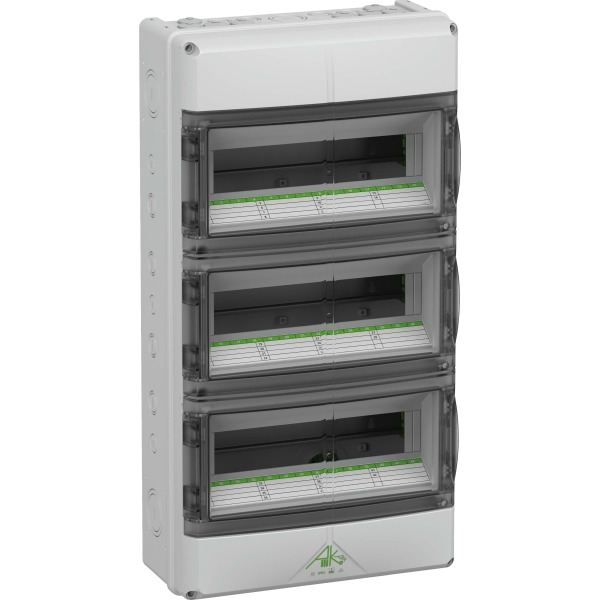 Kleinverteiler, mit Schutzart IP65, 3-reihig, 42 verfügbare Teilungseinheiten, mit integrierten Belüftungselementen zur Verminderung der Kondenswasserbildung, Bemessungsbetriebsspannung: 400V AC, Bemessungsisolationsspannung: 1000V AC, 1500V DC, zertifiziert durch VDE (DIN EN 60670-1/-24 (VDE 0606-1/-24)), UL-EU (EN 62208), UL-EU (EN 61439-1/-2), UL-EU (EN 61439-1/-3), UL-EU (EN 61439-1 & EN IEC 61439-7), DLG (Ammoniakbeständigkeit), oben und unten metrische Vorprägungen für universelle Leitungseinführungen mit Kabelverschraubungen und / oder Doppelmembranstutzen, oben mit elastischen Einführungen DMS M20 vorbestückt, mit schraubenloser PE/N-Klemmschiene mit jeweils 6 schraubbaren Klemmstellen 2,5-16mm² und 21 / 2x14 schraubenlosen Klemmstellen 1,5-4mm²