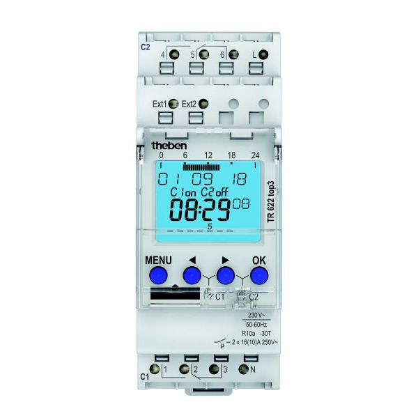 Digitale Zeitschaltuhr für DIN-Schiene, 2 Kanäle, Wochenprogramm, 2 externe Eingänge, 3 Sonderprogramme, Kanalumschaltung und Kanalverriegelung, Breite 2 TE, App-Programmierung möglich, Sichere Übertragung per optionalem Bluetooth Low Energy OBELISK top3, Maximale Manipulationssicherheit, Zeitschaltprogramme können nur dann von der App in die Uhr übertragen werden, wenn der Bluetooth OBELISK top3 in der Uhr steckt, 100 % kompatibel zu top2, 600 Watt LED-Leistung, 800 Ampere/200 Mikrosekunden Einschaltstrom, 0,4 Watt Stand-by Leistung, DuoFix Steckklemmen, Gangreserve und programmierte Sommer-/Winterzeitumstellung, OBELISK-Schnittstelle für PC-Programmierung