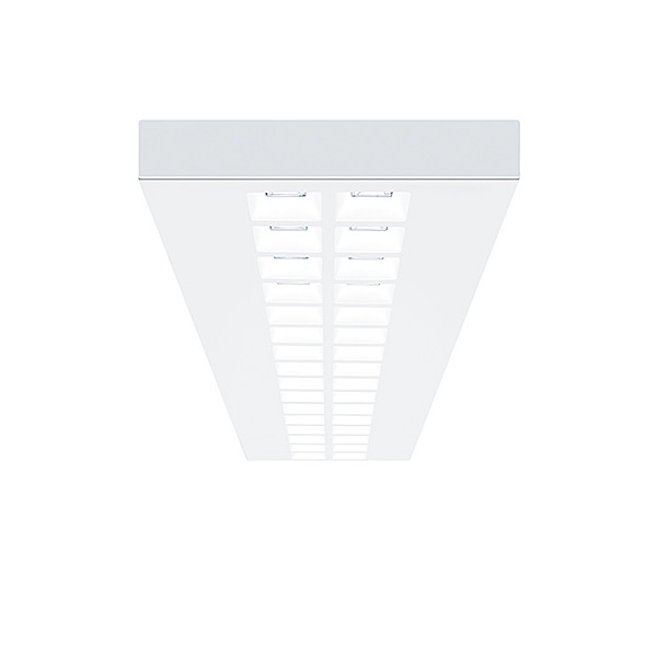 Flache und modulare LED Deckenanbauleuchte mit Linsenoptik. Leuchten Leistung: 25,7 W, mit LED-Konverter, LED-Lebensdauer 50000 h bis zu einem Lichtstromrückgang auf 85 % des Anfangswertes. Farborttoleranz (initial MacAdam): 3. Leuchten Lichtstrom: 3750 lm, Leuchten Lichtausbeute: 146 lm/W. Farbwiedergabe Ra > 80, Farbtemperatur 4000 K. Symmetrisch breit abstrahlende Leuchte. Lichtlenkung über quadratische Linsenoptik entblendete Lichtverteilung mit UGR < 16 und L65 < 1000 cd/m² gemäß EN 12464:2011, geringe Schmutzempfindlichkeit und einfache Reinigung, flaches Leuchtengehäuse aus Stahlblech pulverbeschichtet in weiß, Leuchtengehäuse mit sichtbarer Leuchtenhöhe von 52mm, Leuchte halogenfrei verdrahtet, Abmessungen: 1200 x 300 x 52mm, Gewicht: 7 kg