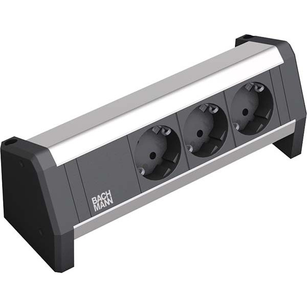BACHMANN DESK 1 Tischanschlussfelder schaffen optimale Voraussetzungen für das Daten-, Medien- und Energiemanagement überall dort, wo Arbeitsplätze flexibel genutzt werden. Beispielsweise in Besprechungsräumen, im Home-Office oder beim Desk-Sharing.DESK- Steckdosenleiste zur Tischmontage für Anschlusskabel mit GST18 - Stecker. DESK kann wahlweise auf der Tischplatte verschraubt oder Möbel schonend mit frei verstellbaren Haltebügeln fixiert werden. 3 Schutzkontaktsteckdosen schwarz Stromeingang: GST18 - Buchse Zuleitung separat erhältlich Haltebügel separat erhältlich verpackt im Einzelkarton Die Vorteile im Überblick Überall flexibel einsetzbar Mit Wieland Stecksystem oder fest angeschlossenen Leitungen Mit Befestigung oder frei aufstellbar auf dem Tisch Custom Versionen für Zukunftssicherheit BACHMANN DESK1 Aufbau-Anschlussfelder DESK schafft optimale Voraussetzungen für das Daten-, Medien- und Energiemanagement überall dort, wo diese Anschlüsse flexibel genutzt werden. Beispielsweise zuhause, in Besprechungsräumen, im Home-Office oder beim Desk-Sharing. Der modulare Aufbau von DESK ermöglicht die individuelle Bestückung ab Werk exakt mit den Kommunikations- und Versorgungsanschlüssen, die für den jeweiligen Einsatz benötigt werden. So stehen beim Stromanschluss sowohl das flexible Wieland Stecksystem als auch fest angeschlossene Leitungen zur freien Wahl. Die Datenanschlüsse sind standardmäßig mit Adaptern ausgestattet, können jedoch ebenfalls mit fest angeschlossener Leitung ausgeführt werden. Der Standard-Stromanschluss ist mit rückseitig im Profil eingebautem Wieland Steckverbinder ausgeführt und bietet die Möglichkeit der sicheren Stromeinspeisung und gleichzeitig Flexibilität in Bezug auf die Länge der Leitung. Die Leitungen können bei Bedarf getauscht werden, um z.B. längere oder kürzere Stromeinspeiseleitungen einzusetzen. Standardmäßig verwenden wir den weltweit verbreiteten Steckverbinder GST18 der Fa. Wieland. Die Steckverbindung verfügt über eine vorschriftsmäßige Verrastung und kann bei Bedarf wieder entriegelt werden. Die Kontaktanschlüsse der Steckverbindung sind berührungssicher. Eine Stromausgangsbuchse bietet die Möglichkeit, Strom an das nächste Modul weiterzuleiten. DESK 1 lässt sich mit einem Haltewinkelset schnell und einfach an die Tischkante montieren. Für die Montage wird ein 4-er Innensechskantschlüssel benötigt, um die innen liegende Schraube am Haltewinkel anzuziehen. Durch die Befestigung wird das Möbel nicht beschädigt.