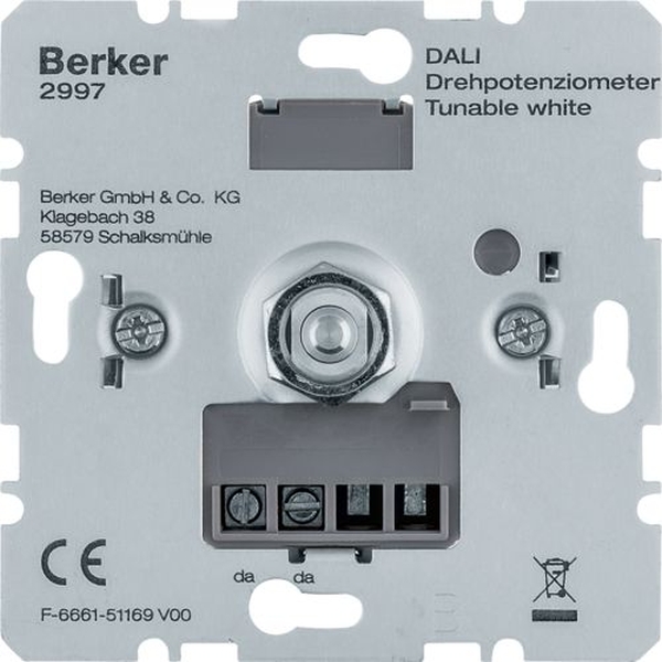 DALI Drehpotenziometer Tunable white ermöglicht präzise Lichtsteuerung und Helligkeitsregulierung. Unterstützt Parallelschaltung bis zu 4 Geräten, netzausfallsichere Speicherung der Einschalthelligkeit und einstellbare Grundhelligkeit. Geeignet für EVG und Tronic-Trafo mit DALI/DSI-Schnittstelle. Kurzschlussfest und überlastsicher durch elektronische Sicherung.