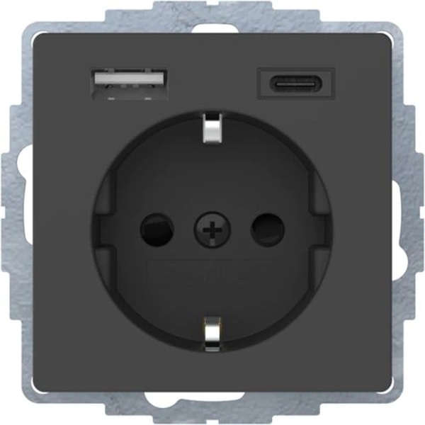 Die SCHUKO/USB A-C Q.x Steckdose in Anthrazit samt, lackiert, kombiniert eine SCHUKO-Steckdose mit zwei USB-Buchsen (Typ A und C) für das Laden von mobilen Endgeräten. Sie ist kurzschlussfest und verfügt über eine elektronische Sicherung für Überlastschutz. Die Steckdose ist für Unterputz- und Hohlwandmontage geeignet und unterstützt schnelle Installation durch Steckklemmen. Ideal für Berker Schalterprogramme.