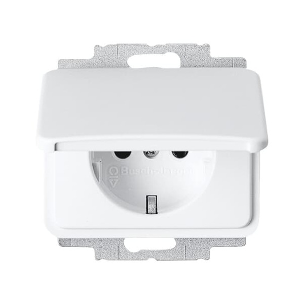 Mit Steckanschluss. 2-polig (2 P + E) Klappdeckel arretiert in geöffnetem Zustand.