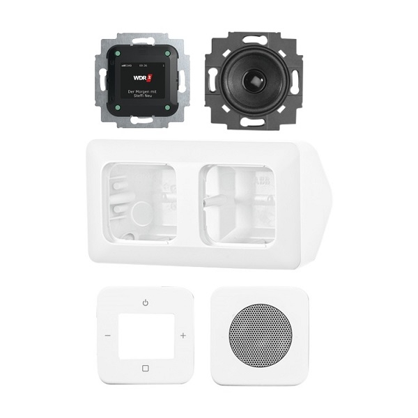 A0235 Einbaufertiger DAB+-Radiowecker für Monobetrieb (Set-Verpackung). Mit hochauflösendem Farbdisplay zur Anzeige von Zusatzinformationen. Bestehend aus Busch-Radio DAB+ 8215 U-101. Bestehend aus Lautsprecher-Einsatz 8223 U. Bestehend aus Zentralscheibe für Busch-Radio 8252-214-101. Bestehend aus Zentralscheibe für Lautsprecher-Einsatz 8253-214. Bestehend aus Aufputz-Gehäuse für Eckmontage 1708-214 inkl. 2-fach Abdeckrahmen. Keine Spreize. Schraubbefestigung über Schlüssellöcher. Designlinie: Reflex SI Designlinie Variante: Reflex SI