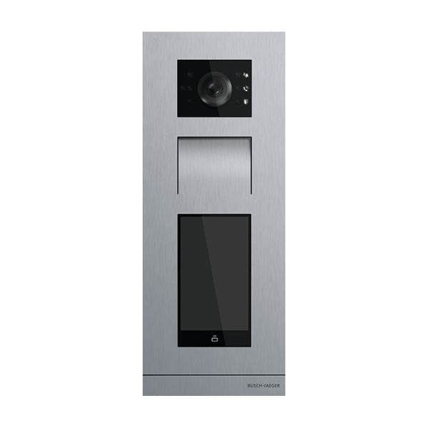 X0027 Videokamera mit automatischer Tag-/Nacht-Umschaltung und Infrarot-LEDs zur Ausleuchtung der Nachtaufnahmen. HD-Kamera (1280 x 720 pixel). Erfassungswinkel diagonal/horizontal/vertikal: 139°/111°/73°. Hinweis : Der Erfassungsbereich der Kamera ist starr und kann mechanisch nicht verändert werden. Integrierte Zustandsanzeige über LED-Symbole (erfüllt DIN 18040). Spezielle Darstellung für Ein-, Zwei- und Dreifamilienhaus Anwendungen. Für Anwendungen im Mehrparteienhaus kann der Name wahlweise über eine Liste oder über ein Tastaturfeld gesucht werden. Display mit Näherungssensor. Darstellung der Klingel-Symbolik zur intuitiven Bedienung. Mit integrierter Sprachrückmeldung (kann deaktiviert werden). Tür öffnen via PIN, QR-Code oder integriertem Transponderleser möglich. Ausgestattet mit einer Hörschleife zur Einkopplung des Audiosignals in Hörgeräte. Zur Aufputzmontage mit 41384S-B-03. Zur Unterputzmontage mit 41384F-B-03. Zur Montage in verputzten Fassaden zusätzlich mit 41384PB-03. Stromversorgung über Power-over-Ethernet (PoE) 802.3af. Alternative Stromversorgung 24 V DC, 330 mA. Anschlussmöglichkeit eines elektrischen Türöffners (18 V, 4 A Impuls, max. 250 mA Dauerhaft). Potenzialfreier Türöffner Ausgang (230 V AC, 3 A oder 30 V DC, 3 A). Alternative Türöffnerfunktion mit REG IP Schaltaktor (H8304-03). Anschlussmöglichkeit für externen Türsensor, zum Detektieren des Türzustands nach einer Türöffnung. Frontplatte aus 3 mm Edelstahl bzw. Aluminium. Produktreihe: Busch-Welcome® IP