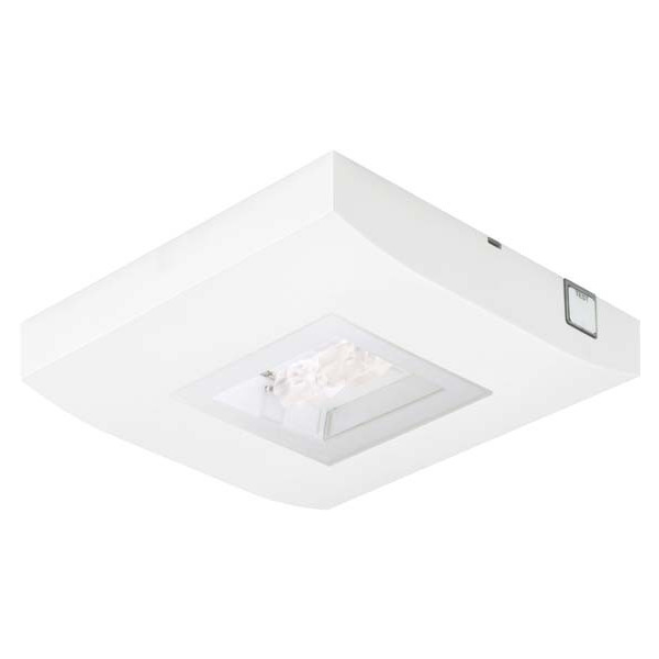 Sicherheitsleuchte mit asymmetrischer Optik für Flurausleuchtung. Einzelbatterieleuchte für den autarken Betrieb oder zum Anschluss an zentrale Überwachungseinrichtung CGLine+. Automatischer Funktionstest (wöchentlich) sowie automatischer Betriebsdauertest (alle 3 Monate), Notlichtbetriebsdauer frei wählbar: 1 h, 3 h oder 8 h, Doppellinsentechnik mit hocheffizienten HighPower LEDs, hohe Lebensdauer 50.000 h, 1 Minute Rückschaltverzögerung nach Netzwiederkehr. Blockierfunktion über zentrale Überwachungseinrichtung für Betriebsruhezeiten. Zulässiger Temperaturbereich: Dauerlicht -5°C bis +30°C / Bereitschaftslicht 0°C bis + 35°C. Montageart: Deckenanbau Leuchtmittel: LED Werkstoff des Gehäuses: Kunststoff Gehäusefarbe: weiß Überwachungseinrichtung: automatischer Selbsttest Ballwurfsicher: Nein Schaltungsart: Dauerschaltung/Bereitschaftsschaltung Mit Fernschalteranschluss (VDE 0100-718, VDE 0108-100): Ja Einspeisung: dezentral (Einzelbatterie) Nennspannung: 220 - 240 V Schutzklasse: II Schutzart (IP): IP41 Nennbetriebsdauer: 8 h Mit Leuchtmittel: Ja Länge: 195 mm Breite: 195 mm Höhe/Tiefe: 38 mm Lichtstrom bei Notbetrieb: 25 %
