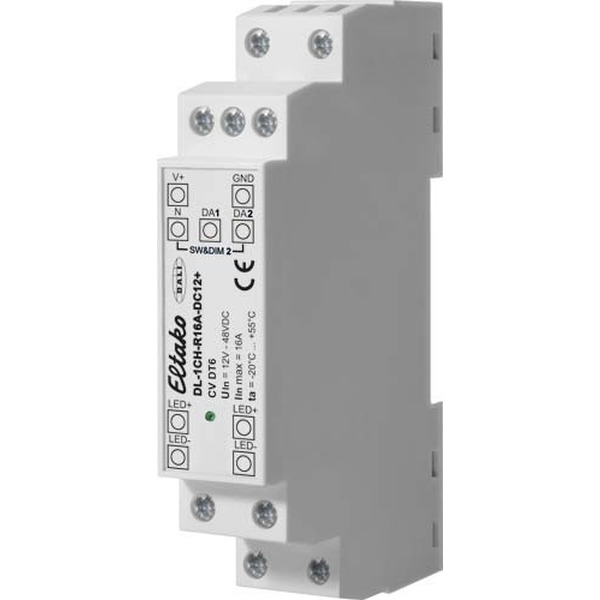 1-Kanal DALI-LED-Dimmer für die Tragschiene DIN-EN 60715 TH35. 98x17,5x56mm. Schutzart IP20. Stand-by-Verlust nur 0,12 Watt. Geeignet zum Ansteuern von Konstantspannungs-LED-Modulen (CV) mit Betriebsspannungen von 12V bis 48V. Sw&Dim oder SwitchDim2: Betrieb über 1 oder 2 Tastereingänge ermöglicht die Steuerung der Helligkeit ohne DALI, alternativ Korridorfunktion zur direkten Ansteuerung mit einem Bewegungsmelder. Dimmbereich 0.1%-100% PWM-Frequenz umschaltbar (122Hz/244Hz/488Hz/976Hz). Versorgungsspannung 12V bis 48V DC. Max. Anschlussstrom 16A. Hoher Wirkungsgrad· Konfiguration über PC-Software DALI-Cockpit und DALI-USB Interface. Betriebsarten: Der Ausgangskanal wird über eine DALI-Adresse (Device Type 6) gesteuert. Die Bedienung kann alternativ auch über einen (Sw&Dim) oder zwei Tastereingänge (SwitchDim2) erfolgen: SwD1,Sw&Dim: Helligkeit. Kurzer Tastendruck: Ein/Aus. Langer Tastendruck: Dimmen. SwD2: Szenenschalter (kurzer Tastendruck). Wird der SwD1-Eingang 2 Minuten lang betätigt, wird auf den Modus Korridorfunktion gewechselt. Diese Betriebsart bleibt bis zum Trennen des Geräts von der Versorgungsspannung aktiv (nach PowerUp: Betrieb über SwD1/SwD2). Korridorfunktion: Modus mit integriertem Treppenhausautomaten (z.B.: für die einfache Ansteuerung mit dem Relaiskontakt von einem oder mehreren Bewegungsmeldern). Bei Betätigung des Eingangs wird auf den Maxwert eingeschalten. Nach Abfall des Eingangssignals verbleibt die Helligkeit für die Dauer der Haltezeit auf diesem Wert bevor sie auf den Zwischenwert abgesenkt wird. Nach Ablauf der Haltezeit für den Zwischenwert wird zum Grundwert der Helligkeit zurückgekehrt. Beim erneuten Ansprechen des Eingangs startet der Ablauf von vorne. Mit der DALI-Cockpit Software kann der 1-Kanal LED-Dimmer konfiguriert werden. Es können sowohl die Gruppenzugehörigkeit festgelegt als auch Szenenwerte und DALI-Parameter konfiguriert werden (die angezeigten Parameter entsprechen dem Auslieferzustand). Auslieferzustand: Vor dem erstmaligen Adressieren kann das Gerät über die Gruppenadressen G0 gesteuert werden. Diese voreingestellte Gruppenzuordnung wird bei der Adressierung gelöscht, danach kann eine beliebige Gruppenzuweisung im DALI-Cockpit vorgenommen werden. Durch Senden eines DALI-Reset-Befehls werden die im DALI-Standard definierten Werte hergestellt.