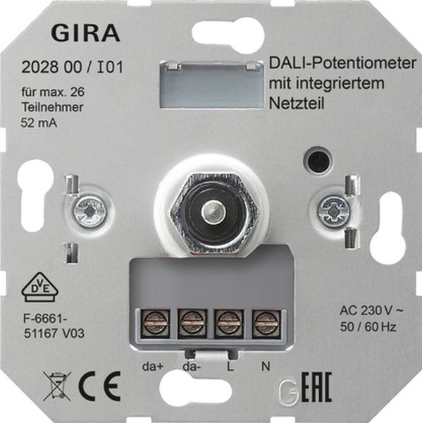 DALI Potentiometer mit integriertem Netzteil - Schalten und Helligkeitseinstellung für Leuchten mit DALI Schnittstelle. - Integrierte Spannungsversorgung nach DALI Spezifikation (DIN IEC 60926) für 26 DALI Teilnehmer. - Parallelschalten von bis zu 4 DALI Potentiometern mit integriertem Netzteil um bis zu 104 DALI Teilnehmer zu versorgen. - Bedienung kann von mehreren Bedienstellen aus parallel erfolgen. Kommunikation erfolgt über Broadcast. - Speichern einer Grund- bzw. Einschalthelligkeit. Bei der Auswahl der DALI Spannungsversorgung ist stets die Anzahl der DALI Teilnehmer und des DALI Potentiometers (gilt immer als 1 Teilnehmer) zu berücksichtigen.