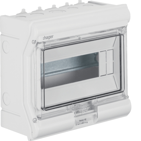 Kleinverteiler, vector, APV, IP65, 10M, UV-stabil, m. metr. Leitungseinführung.Installationskleinverteiler aus Polycarbonat (UV-beständig), nach DIN EN 60670-24, nach DIN 43871. Zum Einbau von Geräten bis 63 A nach Maßnorm DIN 43 880 mit 70 mm oder 85 mm Einbautiefe, Bemessungsspannung AC 400 V/50 Hz. Bestehend aus Kunststoffunterteil mit Hutprofilschiene aus verzinktem Stahlblech, Vorprägung für metrische Leitungseinführungstüllen (oben, unten), seitliche Vorprägungen für Verbindungstüllen zur Verbindung von zwei oder mehreren Verteilern nebeneinander. Oberteil mit 46 mm Geräteschlitz. Klarsichttür frontbündig, rechts oder links anschlagbar, plombierbar, abschließbar, Verteiler anflanschbar.