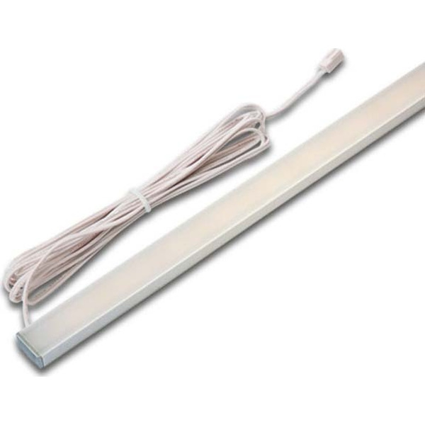 Flache LED-Unterbauleuchte mit homogenem Flächenlicht, Gehäuse Alu, Anschlussleitung 2,5m mit LED 24-Stecker und Leitungsaustritt nach hinten, Lichtfarbe warm weiß ca.3000K. Optionales Zubehör: Dimm-Controller für Funk, DALI oder WiFi