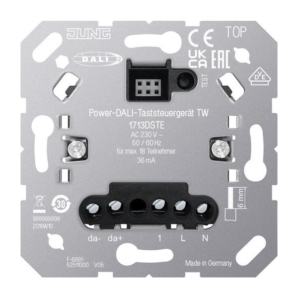 Bestimmungsgemäßer Gebrauch Schalten und Helligkeitseinstellung für Leuchten mit DALI Schnittstelle Einstellung der Farbtemperatur für Leuchten mit DALI Device Type 8 für Tunable White gemäß IEC 62386-209 (nicht in Kombination mit eNet Taster) Montage in Gerätedose mit Abmessungen nach DIN 49073 Betrieb mit geeignetem Aufsatz Das Gerät arbeitet als DALI-2 Single-Master und darf nicht mit weiteren DALI Steuerungen kombiniert werden. Produkteigenschaften DALI-2 zertifiziert DALI Versorgung für maximal 18 DALI Teilnehmer Speichern der Minimalhelligkeit, der kältesten und der wärmsten Farbtemperatur Einschalten mit zuletzt eingestellter Helligkeit/Farbtemperatur oder gespeicherter Helligkeit/Farbtemperatur Mit LB-Management Taster 2fach: Einstellung der Farbtemperatur über rechte Wippe Testbetrieb zur Funktionsprüfung