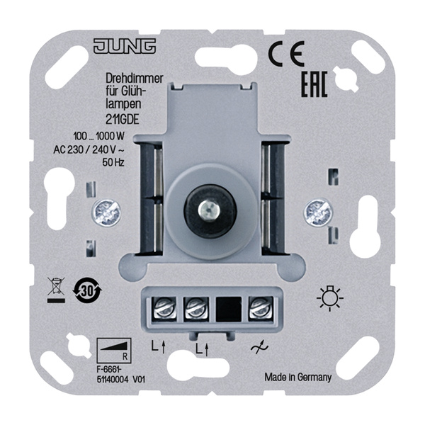 mit Druck-Wechselschalter Bestimmungsgemäßer Gebrauch Schalten und Dimmen von Glühlampen und HV-Halogenlampen Montage in Gerätedose mit Abmessungen nach DIN 49073 Geeignet für Mischbetrieb bis zur angegebenen Gesamtleistung Produkteigenschaften Dimmprinzip Phasenabschnitt Elektronischer Kurzschlussschutz mit dauerhafter Abschaltung spätestens nach 7 Sekunden Elektronischer Übertemperaturschutz Wechselschaltung in Kombination mit Wechselschalter möglich Nennspannung: AC 240 ... 230 V ~ Netzfrequenz: 50 Hz Umgebungstemperatur: 5 ... +25 °C Anschlussleistung bei 25 °C Glühlampen: 100 ... 1000 W HV-Halogenlampen: 100 ... 1000 W Leistungsreduzierung pro 5 °C Überschreitung von 25 °C: 10 % bei Einbau in Holz- oder Trockenbauwand: 15 % bei Einbau in Mehrfachkombinationen: 20 % Anschluss Schraubklemmen eindrähtig: max. 4 mm²