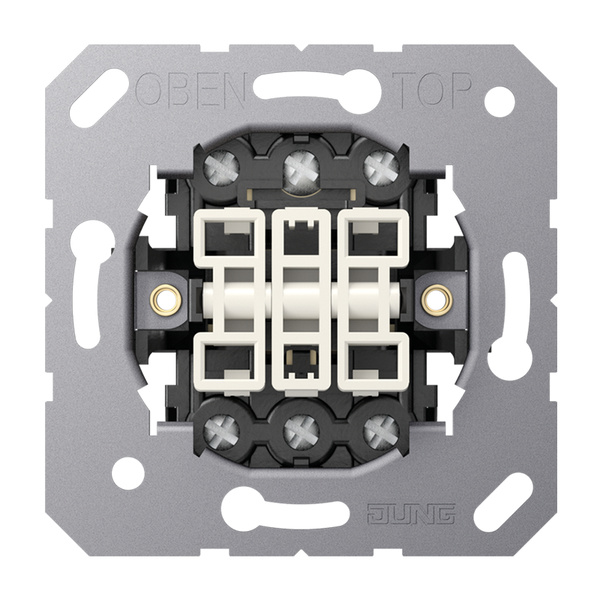 mit Schraubklemmen für starre und flexible Leiter Verbindungsklemmen nach DIN VDE 0632 (EN 60669) (Schraubbefestigung, ohne Befestigungskrallen) Nur zu verwenden in den Serien A und LS. Bei der Montage ist die mittlere Wippe als letztes aufzustecken und bei der Demontage zuerst zu entfernen. Tiefe der Gerätedose (Innenmaß): min. 57 mm