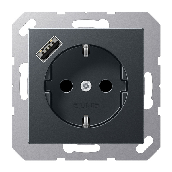 NM mit integriertem erhöhten Berührungsschutz (Safety Plus) mit 1 USB-Buchse Typ A mit Schnellladefunktion (JUNG Quick Charge®) mit Federklemmen für starre und unbehandelte flexible Leiter bis 2,5 mm2 Verbindungsklemmen nach DIN VDE 0620 Montage in Gerätedose mit Abmessungen nach DIN 49073 Tiefe der Gerätedose (Innenmaß): min. 57 mm Material: Thermoplast lackiert