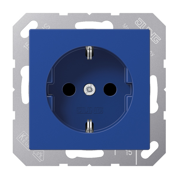 L SCHUKO®-Steckdose, blau mit integriertem erhöhten Berührungsschutz (Safety Plus) mit Federklemmen für starre und unbehandelte flexible Leiter bis 2,5 mm2 Verbindungsklemmen nach DIN VDE 0620 Tragring, Krallen und Krallenschrauben sind über eine Erdungsschiene in die Schutzmaßnahme eingebunden. Material: Thermoplast Maße (B x H): 55 x 55 mm
