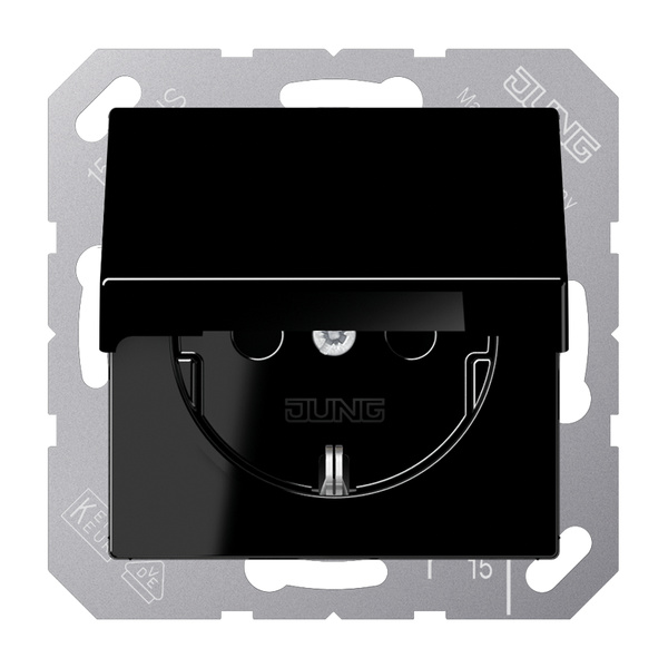 W SCHUKO®-Steckdose, schwarz mit Klappdeckel (mit Rückstellfeder) mit Federklemmen für starre und unbehandelte flexible Leiter bis 2,5 mm2 Verbindungsklemmen nach DIN VDE 0620 Tragring, Krallen und Krallenschrauben sind über eine Erdungsschiene in die Schutzmaßnahme eingebunden. Material: Thermoplast Maße (B x H): 55 x 55 mm