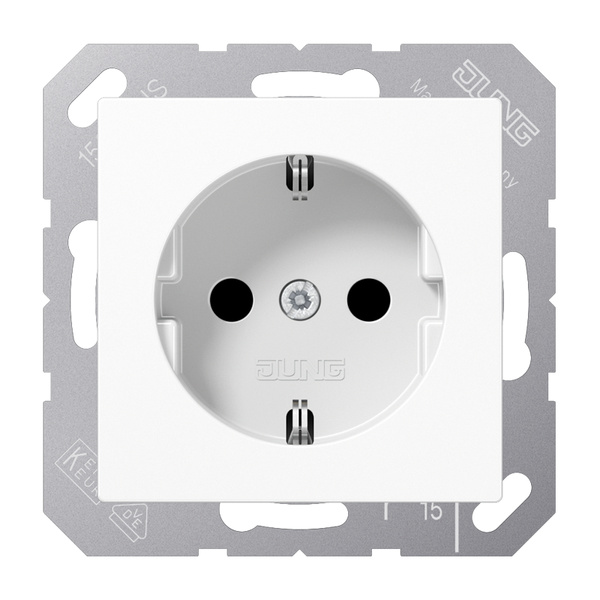 SCHUKO®-Steckdose, alpinweiß mit integriertem erhöhten Berührungsschutz (Safety Plus) mit Federklemmen für starre und unbehandelte flexible Leiter bis 2,5 mm2 Verbindungsklemmen nach DIN VDE 0620 Tragring, Krallen und Krallenschrauben sind über eine Erdungsschiene in die Schutzmaßnahme eingebunden. Material: Duroplast Maße (B x H): 55 x 55 mm