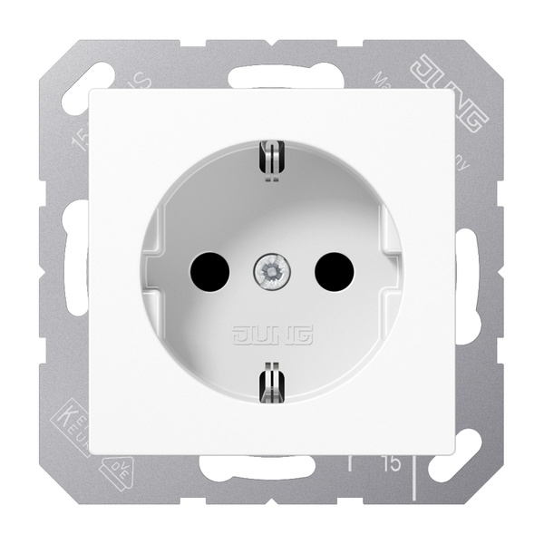 SCHUKO®-Steckdose, alpinweiß mit Federklemmen für starre und unbehandelte flexible Leiter bis 2,5 mm2 Verbindungsklemmen nach DIN VDE 0620 (Schraubbefestigung, ohne Befestigungskrallen) Tragring ist über eine Erdungsschiene in die Schutzmaßnahme eingebunden. Material: Duroplast Maße (B x H): 55 x 55 mm