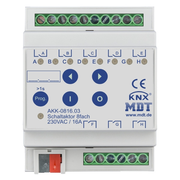 3 KNX Schaltaktor 8-fach, 4TE REG, 16 A, 230 V AC, Kompakt, 70 µF, 10 EVG. Kompakte Ausführung mit bistabilen Relais. Strom max. 16 A bei ohmscher Last, 70 µF / 10 EVG. Funktionserweiterung. Handbedienung sperrbar und LED Anzeige je Kanal. Schließer- und Öffnerbetrieb. Status Rückmeldung für alle Kanäle (auch bei manueller Betätigung). Zeitfunktionen (Ein-/Ausschaltverzögerung). Umfangreiche Treppenlicht- und Impulsfunktion. Logische Verknüpfungen. Erweiterte Szenenfunktion je Kanal. Zentralfunktionen und Sperrobjekte zur Zwangsführung. Einstellbares Verhalten bei Busspannungsausfall/-wiederkehr. 4 mm² Anschlussklemmen. Alle L-Anschlüsse getrennt. Versorgungsspannung über KNX-Bus. Schneller Download der Applikation (long frame support ab ETS 5). 3 Jahre Produktgarantie.