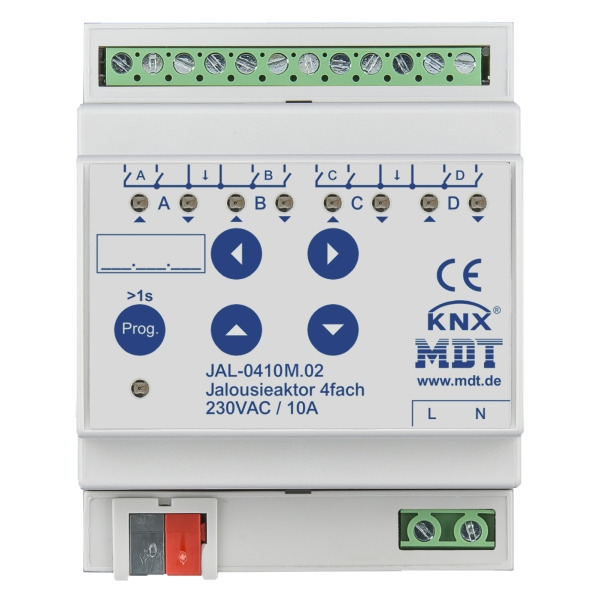 KNX Jalousieaktor 4-fach mit Fahrzeitmessung, 4TE REG, 8 A, 230 V AC. Für 230 V AC Motoren bis 300 W. Mit Sonnenstandsberechnung. Mit Sonnenstandsberechnung. Umfangreiche Applikation. Die Fahrzeiten werden automatisch gemessen und gespeichert. Handbedienung sperrbar und LED Anzeige je Kanal. Betriebsart für Jalousie/Rollladen. Praxisnahe Lüftungsfunktion (Fenster geöffnet/gekippt). Automatische Beschattung/Lamellennachführung mit Sonnenstandsberechnung. Lauf-, Pausen- und Schrittzeit frei einstellbar. Separat einstellbare Verfahrzeiten für Auf/Ab. Tastbetrieb zur genauen Positionierung. Erweiterte 1 Bit Automatikpositionen und Szenenfunktionen. 1 Byte absolute Positionierung für Höhe und Lamelle. Alarm-, Zentral- und Sperrfunktionen. Verhalten nach Alarm und Sperre separat einstellbar. Einstellbares Verhalten bei Busspannungsausfall/-wiederkehr. Je zwei L-Anschlüsse intern gebrückt. Schneller Download der Applikation (long frame support ab ETS 5). 3 Jahre Produktgarantie.