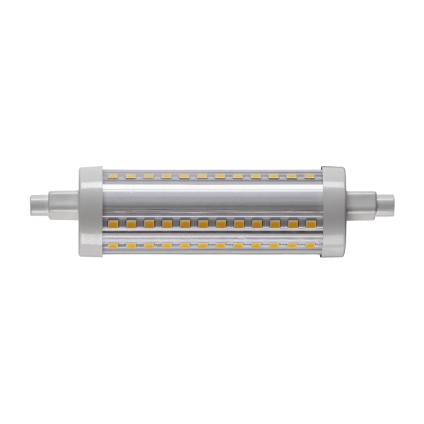 Das transparente 15 W SLV SMD LED Leuchtmittel mit R7S 118 mm Sockel und QT DE12 Form ist dimmbar, hat einen einen CRI -Wert von 90, 800 Lumen sowie eine Lebensdauer von 25.000 Stunden. Diese Version hat einen Abstrahlwinkel von 330° und hat 3.000 Kelvin.