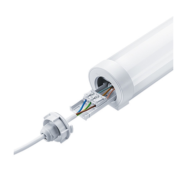 Eine LED-Leuchte der Schutzklasse IP66 für hochwertige, energiesparende Beleuchtung in feuchten, staubigen Umgebungen. Opaler Diffusor für eine gleichmäßige Beleuchtung. Durchgangsverdrahtung: ausgestattet mit zwei 3-poligen Push-Anschlussklemmen (N, Erdungsanschluss, L) als Standard. Einfache, schnelle und werkzeuglose Installation dank Twist-&-Lock-Mechanismus an den Endkappen für Zugriff auf die Push-Anschlussklemmen. Flexible Installation, da die Montageklammern frei an der Leuchte positioniert werden können. Sehr gute Effizienz und bis zu 50% Energieeinsparung im Vergleich zu Leuchten mit T8-Leuchtstofflampen. Gehäuse: Polycarbonat, weiß Diffusor: Polycarbonat, opal Endkappen: Polycarbonat, weiß Befestigungen: Edelstahl Gewicht: 1,65 kg