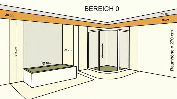 Direkt innerhalb der Badewanne oder des Duschbeckens befindet sich der Bereich 0. In diesem Schutzbereich darfst du nur elektrische Betriebsmittel verwenden, die ausdrücklich hierfür geeignet und erlaubt sind. Dies kann zum Beispiel eine Unterwasserbeleuchtung in einem Whirlpool sein.