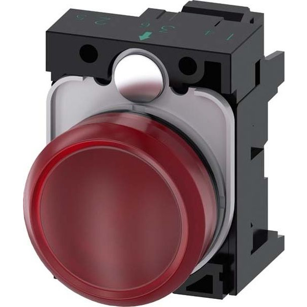 Leuchtmelder, 22 mm, rund, Kunststoff, rot, Linse, glatt, mit Halter, LED-Modul, MIT INTEGRIERTER LED AC/DC 24V, Federzuganschluss Leuchtmelder SIRIUS ACT zur Signalisierung von Schaltzuständen oder Störungen in Anlagen mit brillianter Leuchtkraft dank energieeffizienter LED-Technologie.Unter dem Markennamen SIRIUS ACT bietet Siemens ein einzigartiges Portfolio an Befehls- und Meldegeräten mit weltweiten Produkt-Zulassungen in vier modernen Designreihen aus robustem Echtmetall und hochwertigem Kunststoff.Das innovative Aufschnappkonzept vereinfacht die Montage so weit, dass dafür nur eine Hand und kein Spezialwerkzeug erforderlich ist. Als Montagebohrungen genügen nutfreie Löcher, da bereits ein 100%iger Verdrehschutz integriert ist.Dank der durchgängig hohen Schutzart sind die robusten Geräte industrietauglich und für den Außeneinsatz geeignet. Sogar die Reinigung mit Hochdruckstrahl ist möglich. Weder Staub, Öle noch aggressive Laugen können den zuverlässigen Betrieb stören.Neben der Standardverdrahtung können die meisten Geräte auch über PROFINET, AS-Interface oder IO-Link an die Steuerung angebunden werden. Damit reduzieren Sie Ihren Verdrahtungsaufwand, minimieren Fehlerquellen und gewinnen mehr Flexibilität.Komfortabel unterstützt der grafische Online-Konfigurator bei Auswahl und Bestellung von Einzelgeräten, Gehäusen und Beschriftungen. Umfangreiche Dokumentation (z.B. Handbuch, 3D-Daten, Anschlussdiagramm) ist verfügbar.Lieferbare Ausführungen: mehrere Farben, verschiedene Spannungsvarianten.Hinweis: Komplettgerät, Lieferung inklusive Halter und Module.SIRIUS ACT - Performance in Action beim Befehlen und Melden. Einfach montiert, einfach stark, einfach perfekt.