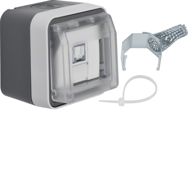 UAE-Steckdose, 8-polig, geschirmt, Kategorie 6, Aufputz, IP Standard 55, geeignet für RJ45-Stecker und PoE+. Ausgestattet mit 2 Leitungseinführungen, 360° Schirmkontaktierung, LSA+ Klemmen und vollflächiger Dichtung. Der Klappdeckel ist transparent und zufallend, um den Schutzgrad IP55 sicherzustellen. Einfache Montage durch Bajonett-Schnellverschluss. Ideal für anspruchsvolle Netzwerkinstallationen.