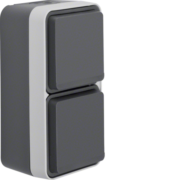 Die SCHUKO 2-fach senkrechte Aufputzsteckdose mit Klappdeckel, Serie W.1, in grau/lichtgrau matt, bietet eine robuste Lösung für dauerhaften Einsatz. Sie ist speziell für die Anforderungen in Feuchträumen konzipiert, dank Schutzabdeckung und wasserabweisendem Design. Die Installation ist durch die vormontierten Anschlüsse und klar gekennzeichnete Klemmstellen vereinfacht. Ideal für den Einsatz im Außenbereich oder in Werkstätten.