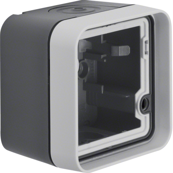 Das Aufputzgehäuse 1-fach mit Rahmen, Modell W.1 in Grau, ist für die Installation im Aufputz-Schalterprogramm konzipiert. Es verfügt über drei Leitungseinführungen und eine vollflächige Dichtung zur Abdichtung der Rückseite. Eine Wago 2-Leiter Verbindungsklemme ist inkludiert, mit zwei weiteren Einrastplätzen für zusätzliche Klemmen. Erreicht Schutzgrad IP Standard 55 in Kombination mit einem modularen Einsatz der Produktlinie W.1.