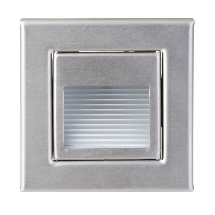 LED-Wandeinbauleuchtenset, schaltbar, edelstahl, quadratisch. Einbaumontage, Wandmontage Set inkl. Konverter zum Anschluss an 230 V-Netzspannung, schaltbar, und Hohlwand-Montagedose Ø DA: 68 mm / Einbautiefe: 65 mm Montageart: Einbaumontage, Montageort: Wandmontage, Material: Edelstahl / Aluminium / Kunststoff, Schutzart raumseitig: nach DIN EN 60529: IP20, Schutzklasse: (EN 61140) I, Spannung: 230V AC 50Hz, Leistung: 1,2 W, Anzahl der Leuchtmittel / Fassungen: 1 Stück, Lichtstrom: 40 lm, Farbtemperatur: 3.000 K, Abstrahlwinkel: 90°, Verstellbarkeit: nicht verstellbar, Mit Betriebsgerät: Ja, Dimmbar: Nein, Art der Dimmung: schaltbar.