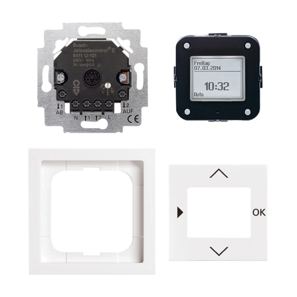 A0408 Bestehend aus Busch-Jalousiecontrol II-Einsatz 6411 U-101. Bestehend aus Komfort-Timer Bedienelement 6455-101. Bestehend aus Reflex SI-Abdeckrahmen, 1-fach 2511-214 Bestehend aus Reflex SI-Zentralscheibe für Timer-Bedienelement 6435-214. Designlinie: future® linear, Plattform 63