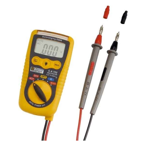 Beschreibung Dank seiner geringen Abmessungen und der fest mit dem Gerät verbundenen Messleitungen können Sie dieses Gerät immer bei sich tragen. AC- und DC-Spannungen: 200 mV bis 600 V Widerstand: 200 O bis 20 MO Durchgangs- (Summer) und Diodenprüfungen Installationskategorie: IEC 61010 - 600 V CAT IV / 1000 V CAT III