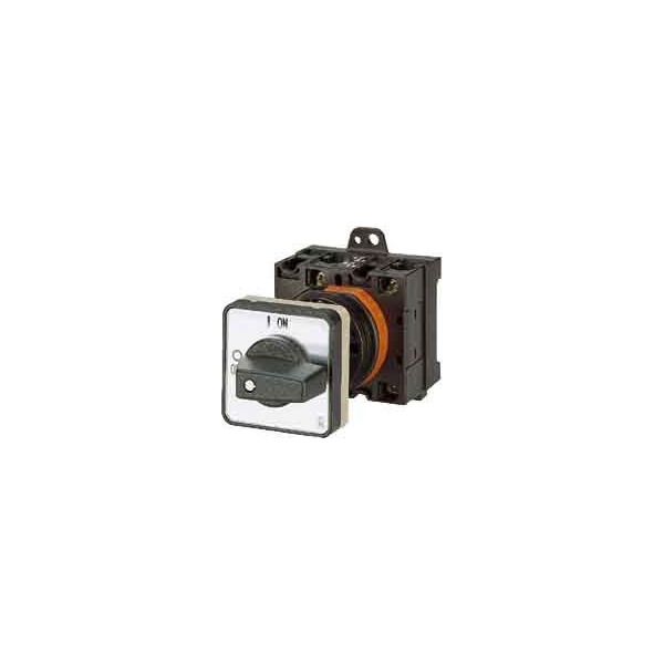 EIN-AUS-Schalter, Sortiment: EIN-AUS-Schalter, Typkenner: T0, mit schwarzem Knebel und Frontschild, 3-polig, Schutzart: Front IP65, Bauform: Zwischenbau, Schaltwinkel: 90 °, Schaltverhalten: rastend, Frontschild: 0-1, Bemessungsbetriebsleistung AC-23A, 50 - 60 Hz 400 V: P = 5.5 kW, Bemessungsdauerstrom: Iu = 20 A, 2 Baueinheit(en), Normen und Bestimmungen: IEC/EN 60947, VDE 0660, IEC/EN 60204, CSA, UL, Lasttrennschalter nach IEC/EN 60947-3