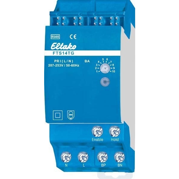 Taster-Gateway für FTS14-Systeme. Stand-by-Verlust nur 1,3 Watt. Reiheneinbaugerät für Montage auf Tragschiene DIN-EN 60715 TH35. 2,5 Teilungseinheiten = 45mm breit, 58mm tief. Zur besseren Wärmeabfuhr muss auf der linken Seite eine ¿ Teilungseinheit Lüftungsabstand eingehalten werden, hierzu das beiliegende Distanzstück DS14 verwenden. Versorgungsspannung 230V. Anschluss an den Eltako-RS485-Bus. Querverdrahtung Bus und Stromversorgung mit Steckbrücke. Betrieb in Verbindung mit FAM14 oder FTS14KS. Mit bis zu 3 Taster-Gateways FTS14TG lassen sich die Telegramme von bis zu 90 über einen 2-Draht-Tasterbus verbundenen 4-fach-Bus-Taster B4T55E bzw. Bus-Tasterkoppler FTS61BTK, FTS61BTKL und FTS61BTK/8 mit den daran angeschlossenen konventionellen Tastern einspeisen. Über nur 2 Adern erfolgt die Datenübertragung und die Stromversorgung gleichzeitig. Dadurch entfallen zahlreiche einzelne Taster-Steuerleitungen. Ein FTS14EM ist dann ggf. nicht erforderlich. Bis zu 30 Stück B4T55E, FTS61BTK, FTS61BTKL und FTS61BTK/8 können an ein Taster-Gateway FTS14TG angeschlossen werden. Über den 2-Draht-Bus erfolgt die Spannungsversorgung der angeschlossenen Geräte mit 29V DC und gleichzeitig die Datenübertragung. Bitte nur gängige Bus- oder Telefonleitungen verwenden. Der 2-Draht-Bus ist galvanisch getrennt vom Eltako-RS485-Bus. Die zulässige Gesamtleitungslänge beträgt 200m. Das dem FTS14TG beiliegende RLC-Glied muss an dem am weitesten entfernten Bus-Taster bzw. Bus-Tasterkoppler zusätzlich an die Klemmen BP und BN angeschlossen werden. Mit einem FTS14FA im Eltako-RS485-Bus werden die Tastertelegramme der angeschlossenen Geräte auch in den Eltako-Gebäudefunk gesendet.