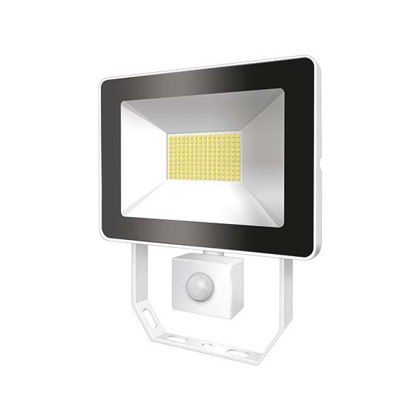 Der kompakte Strahler AFL BASIC eignet sich für die platzsparende Ausleuchtung von Verkehrswegen, Garagen und Plätzen oder die Beleuchtung von Fassaden und Schildern.. Der integrierte Bewegungsmelder ermöglicht einen automatischen und energieeffizienten Betrieb.. LED-Strahler mit kompaktem Aluminiumgehäuse für die unauffällige Montage, weiß.. 50 W Lichtleistung mit 3000 K Lichtfarbe (weiß).. Sehr gute Effizienz mit 100 lm/W.