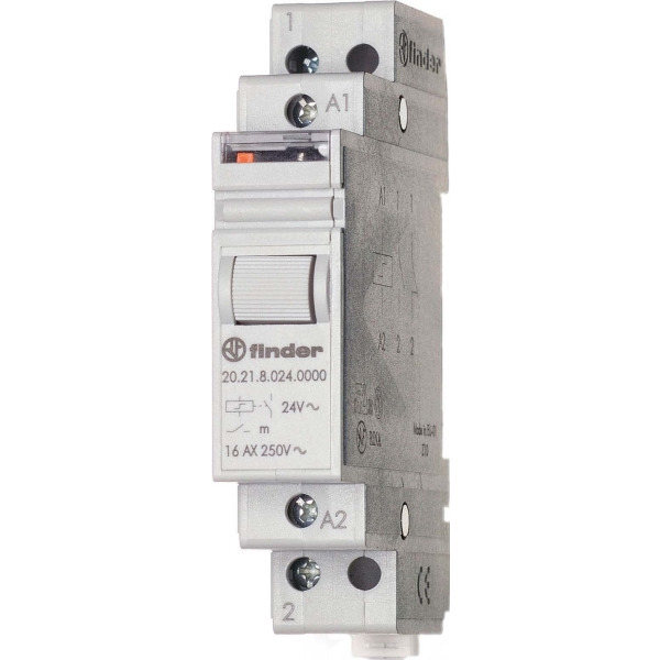 Stromstoßschalter für 35 mm-Schiene, 1 Schließer für 16 A / 250 V AC, Kontaktmaterial AgSnO², max. Schaltleistungen bei 230 V AC: AC1 4000 VA, AC15 750 VA, Glüh- und Halogenlampen 2000 W, Leuchtstofflampen kompensiert 750 W, Leuchtstofflampen unkompensiert 1000 W, Energiesparlampen 400 W, LED (230 V AC) 400 W, NV-Halogenlampen oder LED mit EVG 400 W, NV-Halogenlampen oder LED mit KVG 800 W, Spulendaten: 24 V DC, 5 W, 105 Ohm, Breite 17,5 mm, Schaltfolge: an/aus, Prüftaste und mechanische Schaltstellungsanzeige, Relaisschutzart: IP 20
