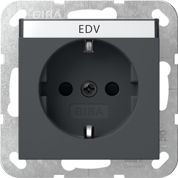SCHUKO-Steckdose 16 A 250 V~ mit Beschriftungsfeld und erhöhtem Berührungsschutz (Safety Plus) Anthrazit System 55 Merkmale: Tragring ist in Verbindung mit den Befestigungskrallen und Krallenschrauben geerdet. Schnellbefestigung (ca. 3,5 Umdrehungen pro Befestigungskralle). Eingehauste Spreizkrallen. Einfachere Krallenbefestigung durch robusten Schraubenkopfantrieb PZ1 / Schlitz / PH. Vereinfachte Installation durch patentierte Anordnung der großen Schlüssellochprofile mittels Dosenschrauben. Geringe Einbautiefe. Große, ergonomisch geformte Lösehebel. Stabiler Erdungsbügel mit massiven Erdungsfingern. Stabiler und korrosionsbeständiger Stahltragring. Bruchsicherer Thermoplastsockel. Hinweise: Erhöhter Berührungsschutz (Safety Plus) gemäß DIN VDE 0620-1. Lieferumfang: Beschriftungsschild EDV ist beigefügt.