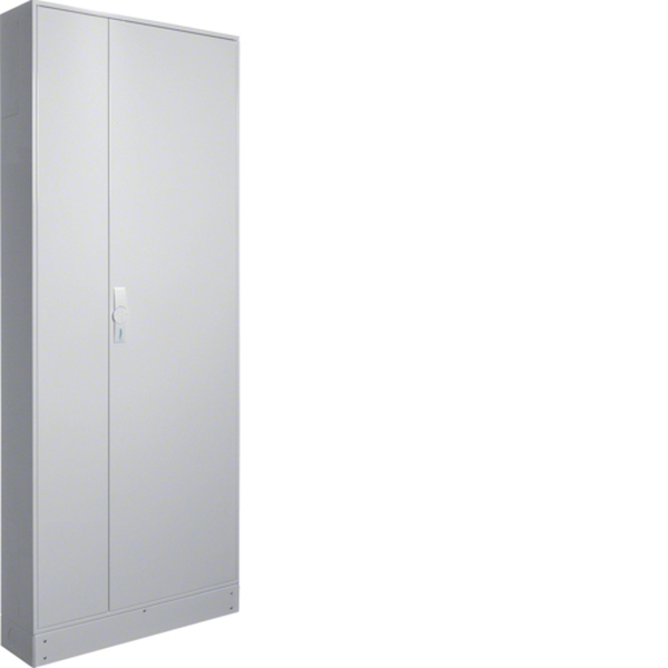 Schrank, univers, IP44/II, 1950x800x205mm, leer.Einzelstandverteiler für die Innenraummontage mit VDE-Gutachten (Fertigungsüberwachung) nach DIN EN 61439-1/-2/-3 und Maßnorm DIN 43870. Zum Aufbau einer Niederspannungsverteilung bis 400 A, 3AC 230/400 V 50 Hz. Schutzart IP44, Schutzklasse II, Luft- und Kriechstrecken nach DIN VDE 0110-1/-2. Bestehend aus Schrank mit Tür aus pulverbeschichtetem, eingebranntem, stabil profiliertem 1 mm dickem Stahlblech, Innenauskleidung aus Kunststoff. Durchsteckflansche oben eingebaut und unten offen, rückseitige Vorprägung im Kunststoffteil und Sammelschienendurchführungen als beidseitige seitliche Vorprägung im unteren Bereich. Waagerechte Abfangschiene zur Stabilisierung im Schrank enthalten. Tür frontbündig mit innenliegenden, justierbaren Scharnieren, wahlweise rechts oder links anschlagbar mit 110 Grad Öffnungswinkel. Tür mit Stangenverschluß mit Dreipunktschließung. Sockelleiste (Höhe 100 mm) serienmäßig montiert mit abnehmbarer Frontblende.Hinweis: Wand- und Bodenbefestigung notwendig! Türverschluß durch andere Schließungen austauschbar. Schrank nebeneinander anflanschbar.