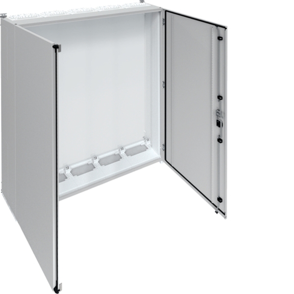 Schrank, univers, IP55/II, 1550x1300x275mm.Wandaufbauschrank für die Innenraummontage mit VDE-Gutachten (Fertigungsüberwachung) nach DIN EN 61439-1/-2/-3 und Maßnorm DIN 43870, zur Aufputz Montage. Zum Aufbau einer Niederspannungsverteilung bis 800 A, 3AC, 690 V 50 Hz. Schutzart IP55, Schutzklasse II, Luft- und Kriechstrecken nach DIN VDE 0110-1/-2. Bestehend aus Schrank mit Tür aus pulverbeschichtetem, eingebranntem, profiliertem 1,5 mm dicken Stahlblech. Durchsteckflansche oben, unten ISO-Flanschplatten mit metrischen Vorprägungen und Schnellverriegelung je Feld eingebaut. Sammelschienendurchführungen als seitliche Vorprägung. Tür aufliegend, mit innenliegenden Scharnieren, Türanschlag standardmäßig rechts, wechselbar, 110 Grad Öffnungswinkel. Serienmässig mit Schwenkhebelverschluss, DIN-Profil-Halbzylinder einbaubar. Türdichtung umlaufend geschäumt, temperaturbeständig und ölbeständig. Schrank nebeneinander und übereinander anflanschbar.