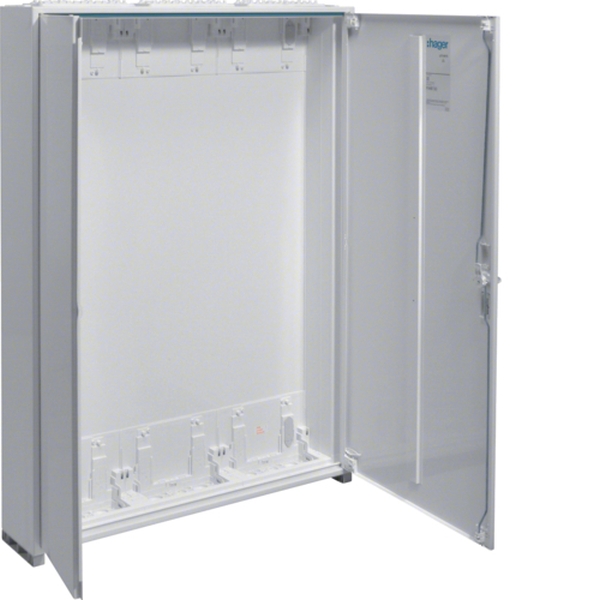 Feldvert. AP, univ., IP44, SKII, 252PLE, 3x7 Reihen 1100x800x161mm, leer mit Tür.Feldverteiler nach DIN EN 61 439-1/-3, Maßnorm nach DIN 43 870. Zum Einbau für Geräte bis 125 A, Luft- und Kriechstrecken nach DIN EN 60664-1. Bestehend aus Schrank mit Tür aus pulverbeschichtetem und eingebranntem Stahlblech. Ab Schrankbreite 800 mm (3-feldig) zwei türiger Aufbau. Rechte Türen maximal 2-feldig breit. Leerschrank ohne Einbausatz. Leitungseinführungen oben/unten durch herausnehmbare flexiblen Kunststoffflanschplatten, zusätzlich austauschbar. Tür mit innenliegenden justierbaren Scharnieren und einem Öffnungswinkel von 110°. Türen rechts und links anschlagbar, werkzeugloser wechselbar Türanschlag. Türverschluss serienmäßig mit Dreipunkt-Stangenverschluss und plombierbaren Klappgriff. Austauschbare sperrbare Schließsysteme und Türen, siehe Zubehör.