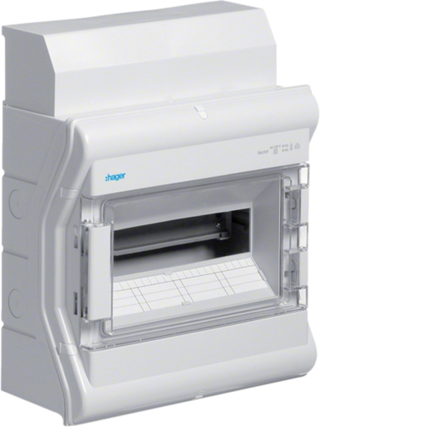 Kleinverteiler, vector, APV, IP65, 12PLE, mit Rangierkanal.Installationskleinverteiler AP aus Kunststoff, nach DIN EN 60670-24, nach DIN 43871. Zum Einbau von Geräten bis 63 A nach Maßnorm DIN 43 880 mit 70 mm oder 85 mm Einbautiefe, Bemessungsspannung AC 400 V/50 Hz. Bestehend aus Kunststoffunterteil mit Hutprofilschiene aus verzinktem Stahlblech, Vorprägung für metrische Leitungseinführungstüllen (oben, unten), seitliche Vorprägungen für Verbindungstüllen zur Verbindung von zwei oder mehreren Verteilern nebeneinander. Eingebaute PE/N-Klemmen Schnellsteckklemme, Oberteil mit 46 mm Geräteschlitz. Klarsichttür frontbündig, rechts oder links anschlagbar, plombierbar, abschließbar, Verteiler anflanschbar.