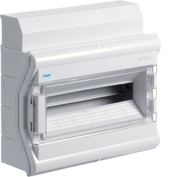 Kleinverteiler, vector, APV, IP65, 18PLE, mit Rangierkanal.Installationskleinverteiler AP aus Kunststoff, nach DIN EN 60670-24, nach DIN 43871. Zum Einbau von Geräten bis 63 A nach Maßnorm DIN 43 880 mit 70 mm oder 85 mm Einbautiefe, Bemessungsspannung AC 400 V/50 Hz. Bestehend aus Kunststoffunterteil mit Hutprofilschiene aus verzinktem Stahlblech, Vorprägung für metrische Leitungseinführungstüllen (oben, unten), seitliche Vorprägungen für Verbindungstüllen zur Verbindung von zwei oder mehreren Verteilern nebeneinander. Eingebaute PE/N-Klemmen Schnellsteckklemme, Oberteil mit 46 mm Geräteschlitz. Klarsichttür frontbündig, rechts oder links anschlagbar, plombierbar, abschließbar, Verteiler anflanschbar.
