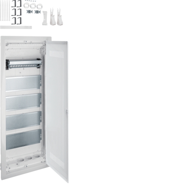 Multimedia, volta, UPV, 5-reihig, mit geschlitzter Kunststofftür.Installationskleinverteiler Unterputz aus Kunststoff, nach DIN VDE 61439-3, geeignet zum Einsatz in Wohngebäuden nach DIN 18015 und zum Einbau von schutzisolierten VDI Komponenten. Schutzart IP30, Schutzklasse II schutzisoliert.Bestehend aus Kunststoff-Mauerkasten mit serienmäßigem Leitungsabfang, ausbrechbarem Leitungseinführungsschieber mit Schnappbefestigung, integrierter Wasserwaage und verzinkten Stahlblech-Befestigungslaschen. Verdrehbarer Blendrahmen mit Lüftungstür aus Stahlblech mit geschlitztem Kunststoffeinsatz für ein besseres WLAN-Signal, pulverbeschichtet und eingebrannt, mit 15 mm Putzausgleich. Lüftungstür, frontbündig mit innenliegenden handbedienbaren Scharnieren. Türverschluss mit frontbündiger Griffmulde und selbsttätig zurückklappendem Griff, Türanschlag rechts oder links ohne Blendrahmen-Demontage.Oberer Anschlussraum: Patch Panel und DIN-Hutschiene isoliert aufgerastet zur Aufnahme von unterschiedlichen Kommunikationsmodulen, für den geforderten Funktionspotentialausgleich nach DIN EN 50310(VDE 0800-2-310) sind am Patch Panel 2 Schraubbefestigungen vorhanden. Beschriftungsmöglichkeit mit beiliegendem Bezeichnungsstreifen zur Portbeschriftung. Vormontierte gelochte Montageplatten aus verzinktem Stahlblech mit 3,2 mm Lochung sind eingebaut. Ein Universalhaltebügel kann für die schraublose Befestigung von VDI-Komponenten direkt auf dem Lochblech eingehängt werden.Im unteren Anschlussraum ist eine 3-fach Schutzkontaktsteckdose (90° drehbar) montiert. Über eine Anschlussklemme sind die Steckdosen direkt anschließbar. Die Steckdosen sind mit einer beiliegenden Schutzkontaktabdeckung zur Einhaltung der Schutzklasse II bestückbar.Hinweis: Ein Überspannungsschutzmodul Typ 3 kann direkt angeschlossen werden (nicht enthalten).