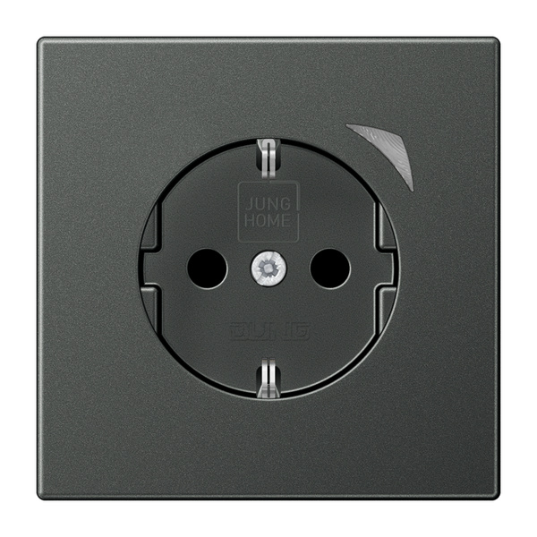 N-L JUNG HOME SCHUKO® Steckdose, anthrazit mit integriertem erhöhten Berührungsschutz (Safety Plus) mit Schraubklemmen für starre und flexible Leiter bis 2,5 mm2 Verbindungsklemmen nach DIN VDE 0620 Tragring, Krallen und Krallenschrauben sind über eine Erdungsschiene in die Schutzmaßnahme eingebunden. Bestimmungsgemäßer Gebrauch Manuelles oder automatisches Schalten von Beleuchtung und haushaltsüblichen Geräten Drahtlose Verknüpfung mit Geräten des JUNG HOME Systems Einsatz im trockenen Innenbereich Montage in Gerätedose mit Abmessungen nach DIN 49073 Tiefe der Gerätedose (Innenmaß): min. 53 mm Produkteigenschaften Inbetriebnahme und Bedienung über JUNG HOME App mit mobilem Endgerät (Smartphone oder Tablet) über Bluetooth® Taste zum Schalten Mehrfarbige Statusanzeige mit optionalem Nachtmodus Sperren der lokalen Bedienung Bis zu 16 Zeitprogramme Ein-/ Ausschaltverzögerung Einbindung der Last in Bereiche (Gruppen), Zentralfunktionen und Szenen Automatikfunktionen aktivieren/deaktivieren über JUNG HOME App Sperr- und Zwangsführung: Dauer-EIN/AUS oder für feste Zeit EIN/AUS Automatische Datum- und Uhrzeitaktualisierung bei Verbindung mit mobilem Endgerät Zeitprogramme mit Sonnenauf- bzw. Sonnenuntergang (Astrotimer) Integrierter Schaltaktor mit 16 A Bluetooth® Mesh für voll verschlüsselte drahtlose Kommunikation und Repeaterfunktion Updatefähig über JUNG HOME App Material: Thermoplast lackiert Maße (B x H): 70 x 70 mm