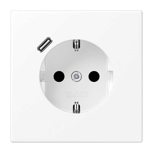WWM mit integriertem erhöhten Berührungsschutz (Safety Plus) mit 1 USB-Buchse Typ C mit Schnellladefunktion (JUNG Quick Charge®) mit Federklemmen für starre und unbehandelte flexible Leiter bis 2,5 mm2 Verbindungsklemmen nach DIN VDE 0620 Montage in Gerätedose mit Abmessungen nach DIN 49073 Tiefe der Gerätedose (Innenmaß): min. 57 mm Material: Thermoplast lackiert