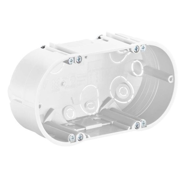"Doppel-Geräte-Verbindungsdose, Tiefe 47 mm, halogenfrei (9062-77). Die neuen KAISER Hohlwand Installationsdosen mit bewährter Laschen-Befestigungstechnik und verbesserten Produktmerkmalen. Eine praxisgerechte Bauform und eine gezielte Auswahl an Leitungs- und Rohreinführungen ermöglichen eine Vielzahl an Nutzungsmöglichkeiten. Zusätzliche Dosen für Sonderanwendungen wie den Einbau in dünn beplankte Wände oder Wände aus Massivholz runden das vielfältige Sortiment ab. Die VDE Zertifizierung dokumentiert dabei den hohen Qualitätsanspruch. Installationsart: Basis-Installation