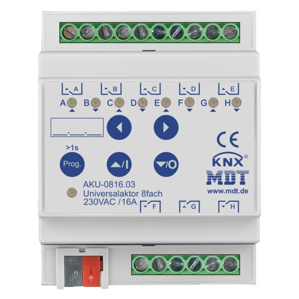 3 KNX Universalaktor 8-fach, 4TE REG, 16 A, 230 V AC, 100 µF, 15 EVG. Kompakte Ausführung mit bistabilen Relais. Strom max. 16 A bei ohmscher Last, 100 µF / 15 EVG. Mit Sonnenstandsberechnung. Kann als Schaltaktor (max. 8-fach) oder Jalousieaktor (max. 4-fach) eingesetzt werden. Beliebige Mischformen aus Schalt- und Jalousieaktor. Heizungsansteuerung mit PWM 0-100 %. Taster für Handbetrieb und LED Anzeige je Kanal. Praxisnahe Lüftungsfunktion (Fenster geöffnet/gekippt). Automatische Beschattung/Lamellennachführung mit Sonnenstandsberechnung. Zeitfunktionen (Ein-/Ausschaltverzögerung, Treppenlichtfunktion). Status Rückmeldungen für alle Kanäle (aktiv/passiv). Logische Verknüpfungen, 8 Szenen je Kanal. Zentralfunktionen und Sperrobjekte zur Zwangsführung. Betriebsart für Jalousie/Rollladen. Lauf-, Pausen- und Schrittzeit frei einstellbar. 1 Bit Automatiksteuerung und Sonnenschutzfunktion. 8 Bit Positionierung für Höhe und Lamelle. Einstellbares Verhalten bei Busspannungsausfall/-wiederkehr. 4 mm² Anschlussklemmen. Alle L-Anschlüsse getrennt. 3 Jahre Produktgarantie.